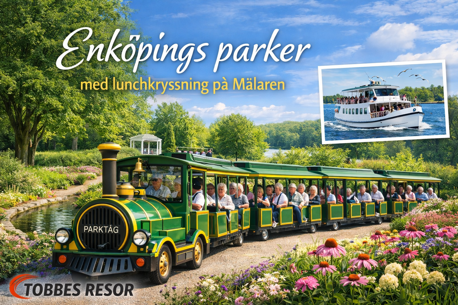 På den här turen så åker vi sjövägen från Västerås in till Enköpings centrum med M/S Havsörnen. Ombord så avnjuter vi en god lunch inkl kaffe och kaka, turen tar ca tre timmar. Väl framme i Enköping får vi en guidad tur med parktåget i dom vackra parkerna. Beroende på hur stor gruppen är så kan ni delas upp på två, den ena gruppen kikar på egen hand och den andra gruppen åker tåget. Sen byter man.